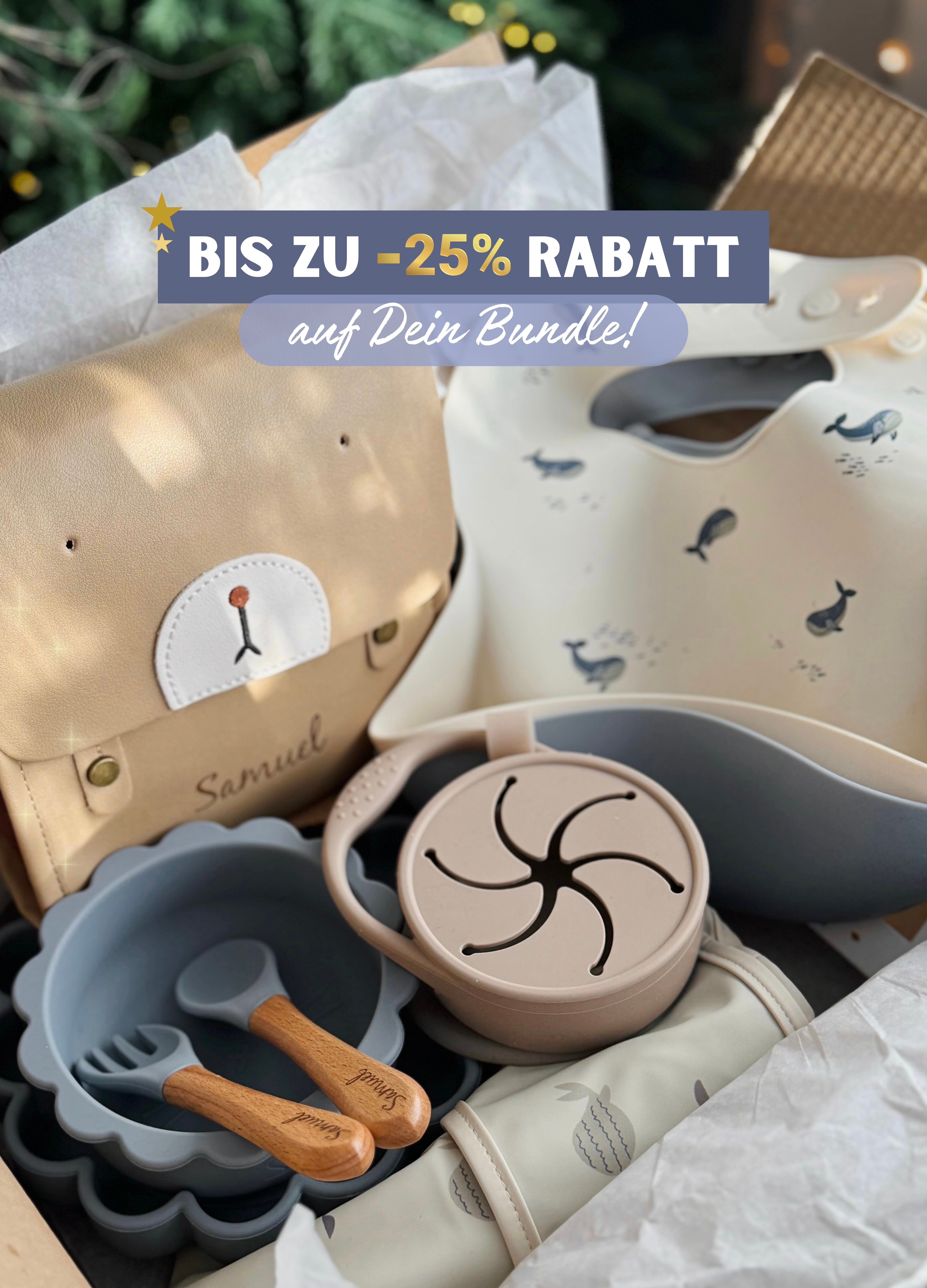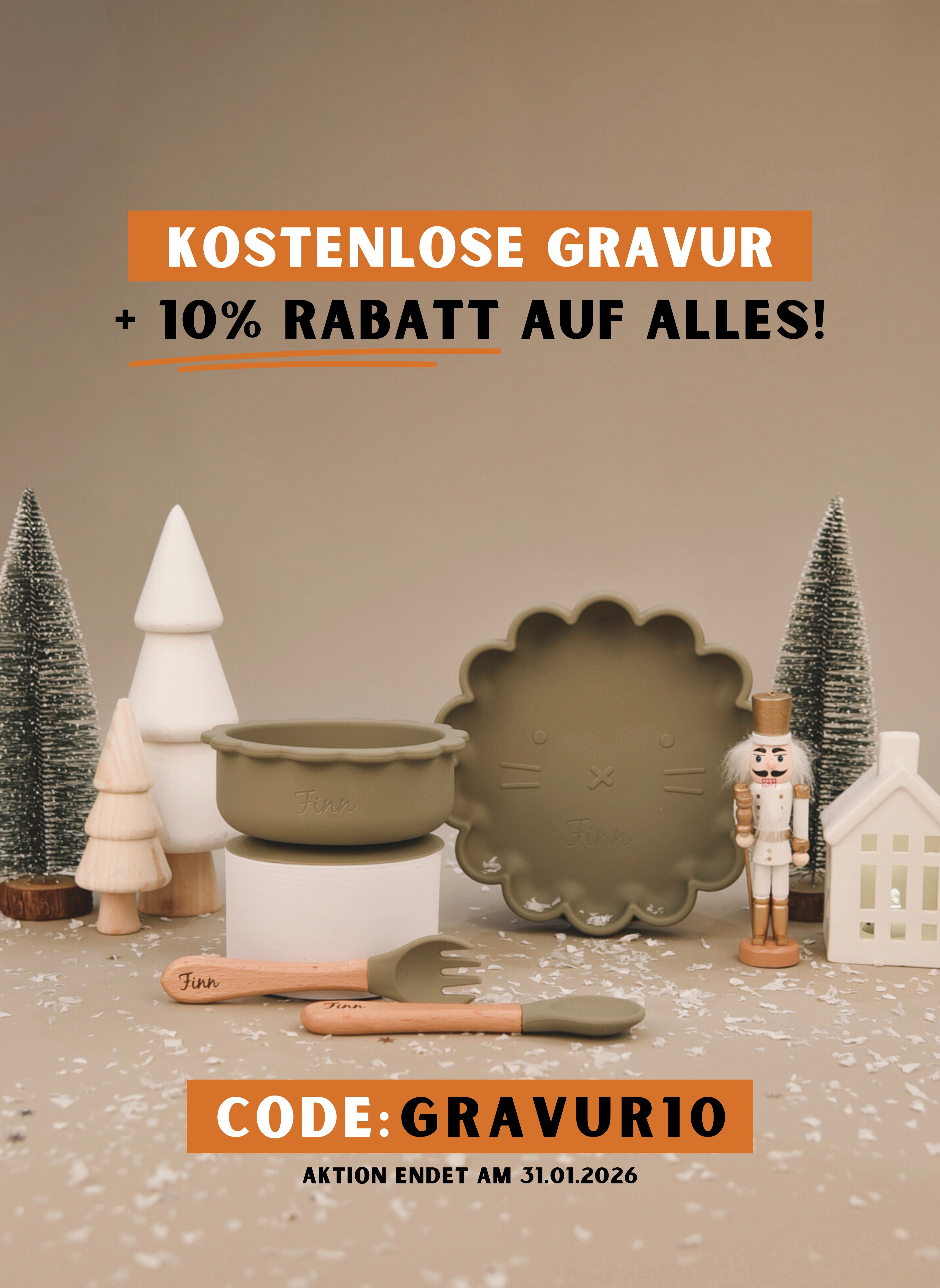 Mit unseren babyfreundlichen Silikonlätzchen und dem rutschfesten Silikongeschirr mit Saugnapf bleibt die Mahlzeit entspannt und das Essen dort, wo es hingehört. Alle Produkte sind schadstofffrei, sicher für Babys und so langlebig, dass sie euch zuverlässig durch viele gemeinsame Mahlzeiten begleiten.