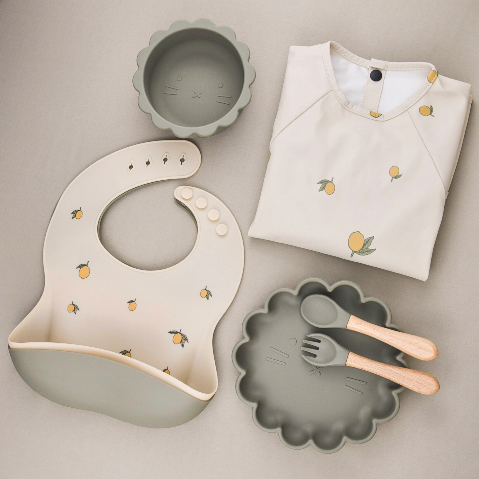Unser Babygeschirrset aus weichem Silikon ist ideal für den Beikoststart. Es enthält einen Teller und eine Schale, beide mit Saugnapf für sicheren Halt auf dem Tisch und einem liebevoll gestalteten Löwenmotiv, das Kindern beim Essen Freude macht. Dazu kommen ein weicher Löffel und eine passende Gabel. Ergänzt wird das Set durch ein wasserabweisendes, pflegeleichtes Langarmlätzchen, das waschmaschinengeeignet ist (bis 30 °C) sowie zwei Silikonlätzchen mit praktischer Auffangschale.