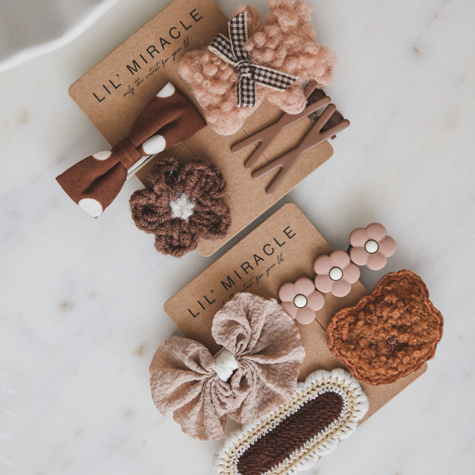 Dieses neunteilige Haarspangenset ist in Beige oder Braun erhältlich und besteht aus farblich abgestimmten Designs mit liebevollen Details. Einige der Spangen sind mit einem niedlichen Bärenmotiv verziert, andere ergänzen das Set in schlichtem Stil.