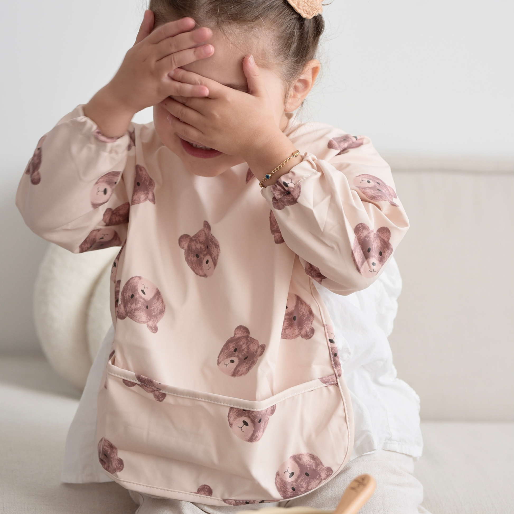 Das Langarmlätzchen ist bei 30 °C in der Waschmaschine oder per Hand waschbar.