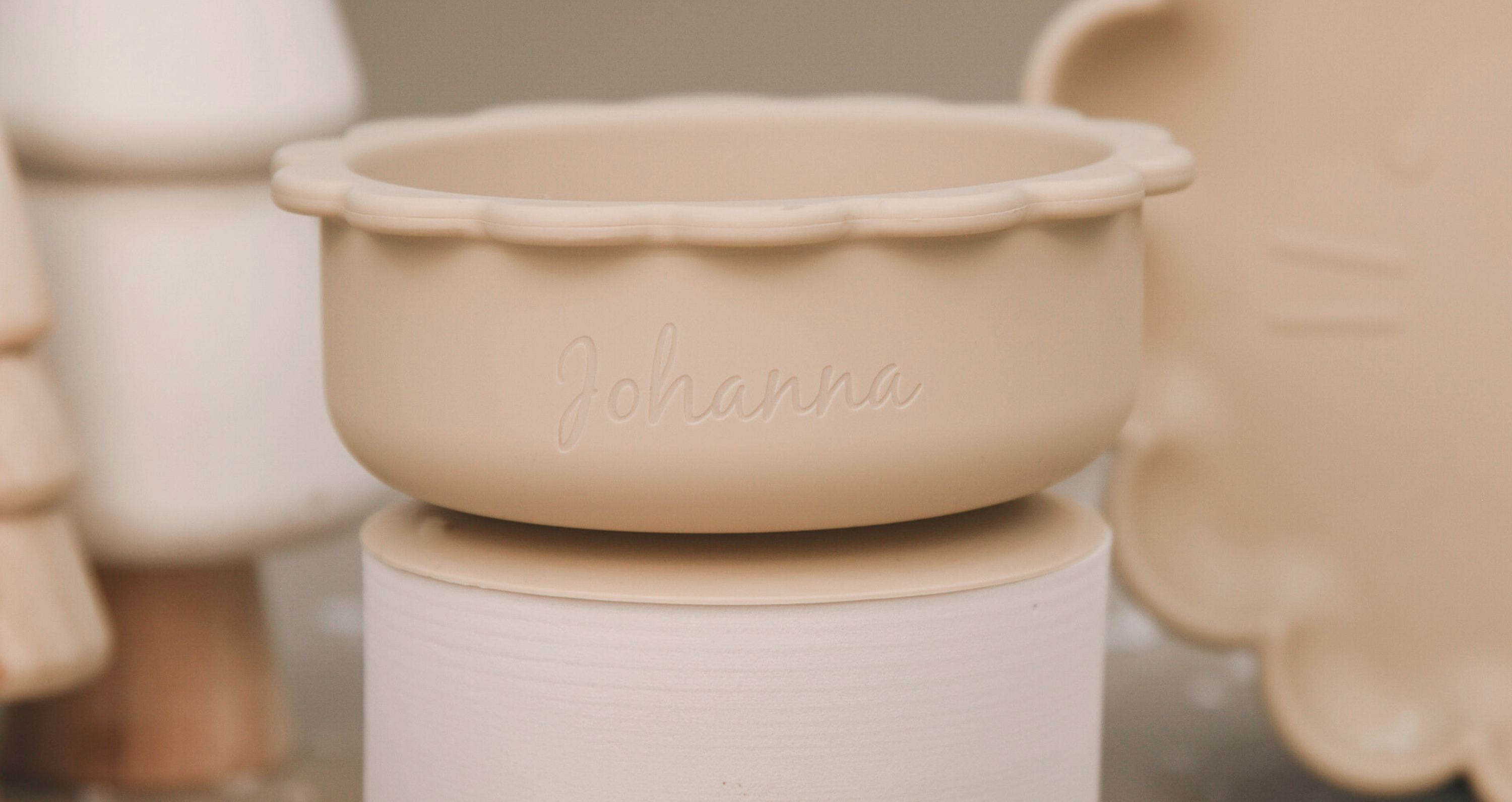 Auf Wunsch gravieren wir Teller, Schale, Besteck und Lätzchen mit dem Namen des Kindes – eine schöne Erinnerung zur Geburt oder zum ersten Geburtstag.